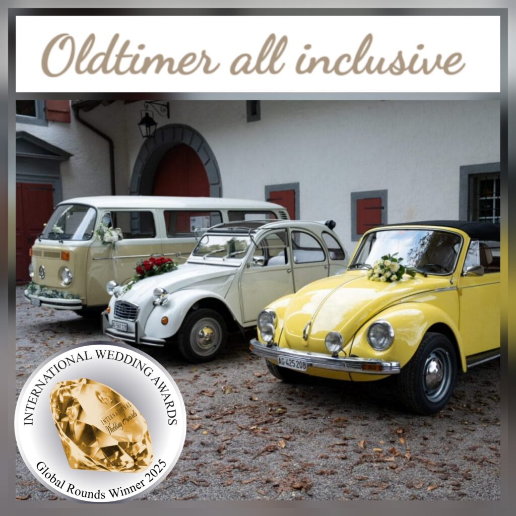 Ob Hochzeit, Jubiläum, Firmenanlass oder besondere Ausfahrt – mit einem stilvollen Oldtimer von Oldtimer-all-inclusive verleihen Sie Ihrem Event das gewisse Etwas. Oldtimer-all-inclusive.ch bietet eine exklusive Flotte von 8 wunderschönen Oldtimern im erstklassigen 1A-Zustand, darunter auch VW Käfer Cabrio, Cadillac DeVille, Rolls Royce Silver Spirit, Jaguar X-Type, Chevrolet 210 Wagon, Cadillac Fleetwood, Citroen 2 CV und den beliebten VW Bus T2 (Bulli)– mit Chauffeur buchbar, der Citroen und VW Bus T2 auch zur Selbstfahrt.